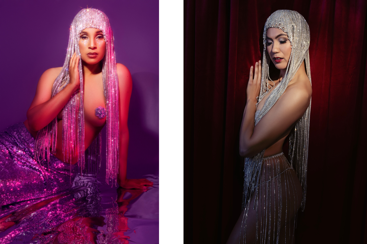 In the studio, I have an extensive wardrobe of designer pieces and accessories, from glamorous gowns to flowing robes to pearl bras and diamond wigs and my signature Victoria’s Secret-style angel wings. You’re welcome to mix and match from my collection and bring your own pieces too.